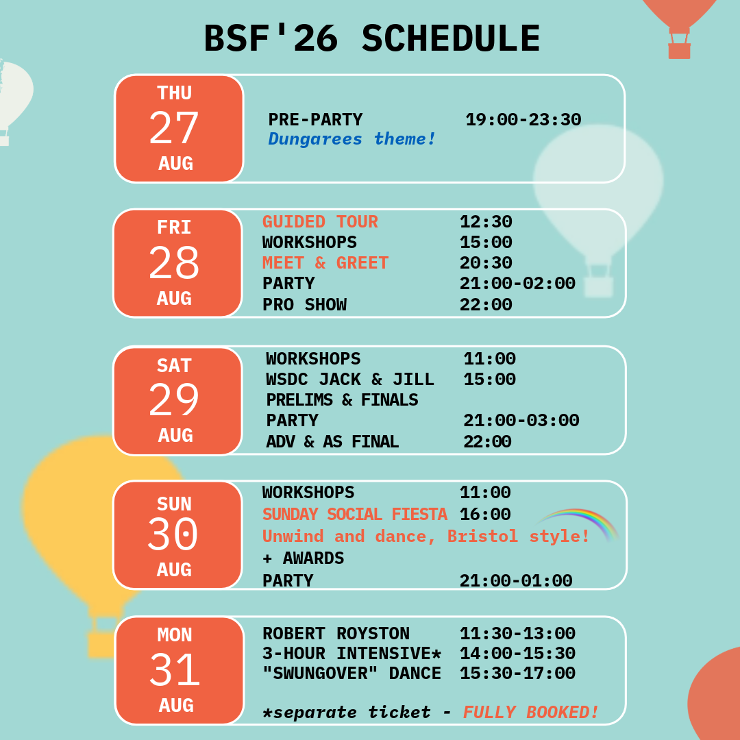 Intensive with Robert Royston + dance on 31st August 2026 (£60 per person). Fully booked! You can join the waitlist by emailing us at: bristolcityswing@gmail.com
